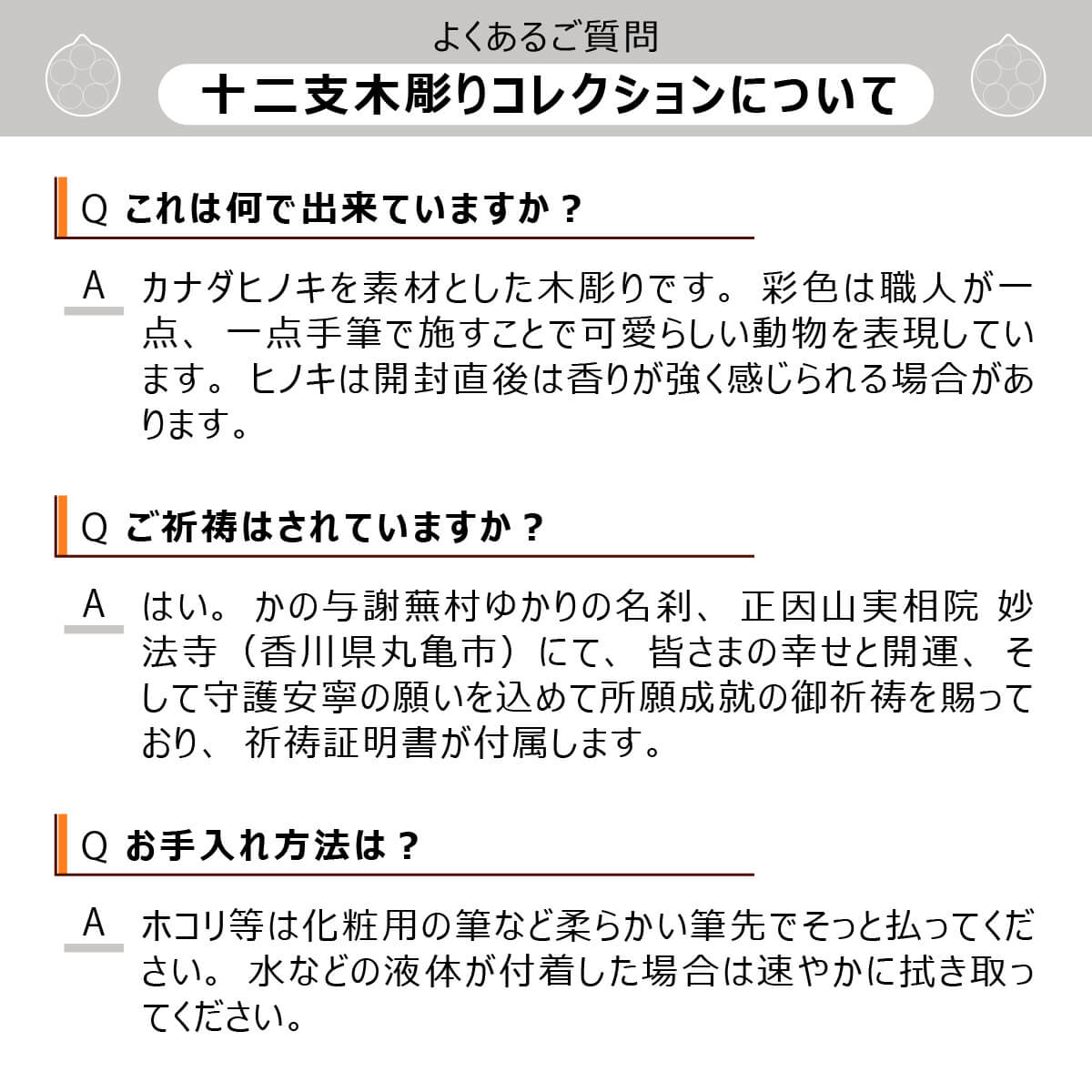 天然木を使用し、手作業で彩色を仕上げを施した木彫り製品です。木目ならびに彩色の個体差は選べません。製造上避けられない繊維の毛羽立ちや細かなキズがあります。開封直後は木の香りが強く感じられる場合があります。