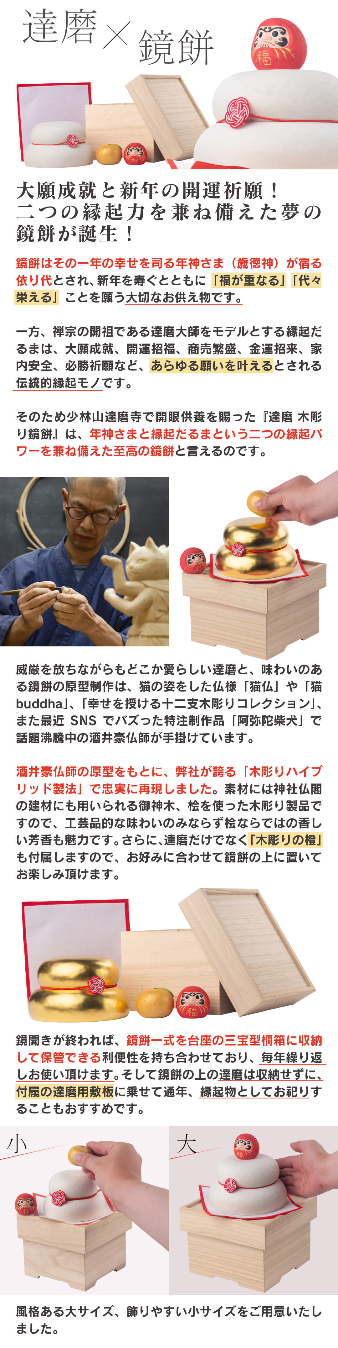 そのため少林山達磨寺で開眼供養を賜った『達磨 木彫り鏡餅』は、年神さまと縁起だるまという二つの縁起パワーを兼ね備えたことで至高の鏡餅と言えるのです。