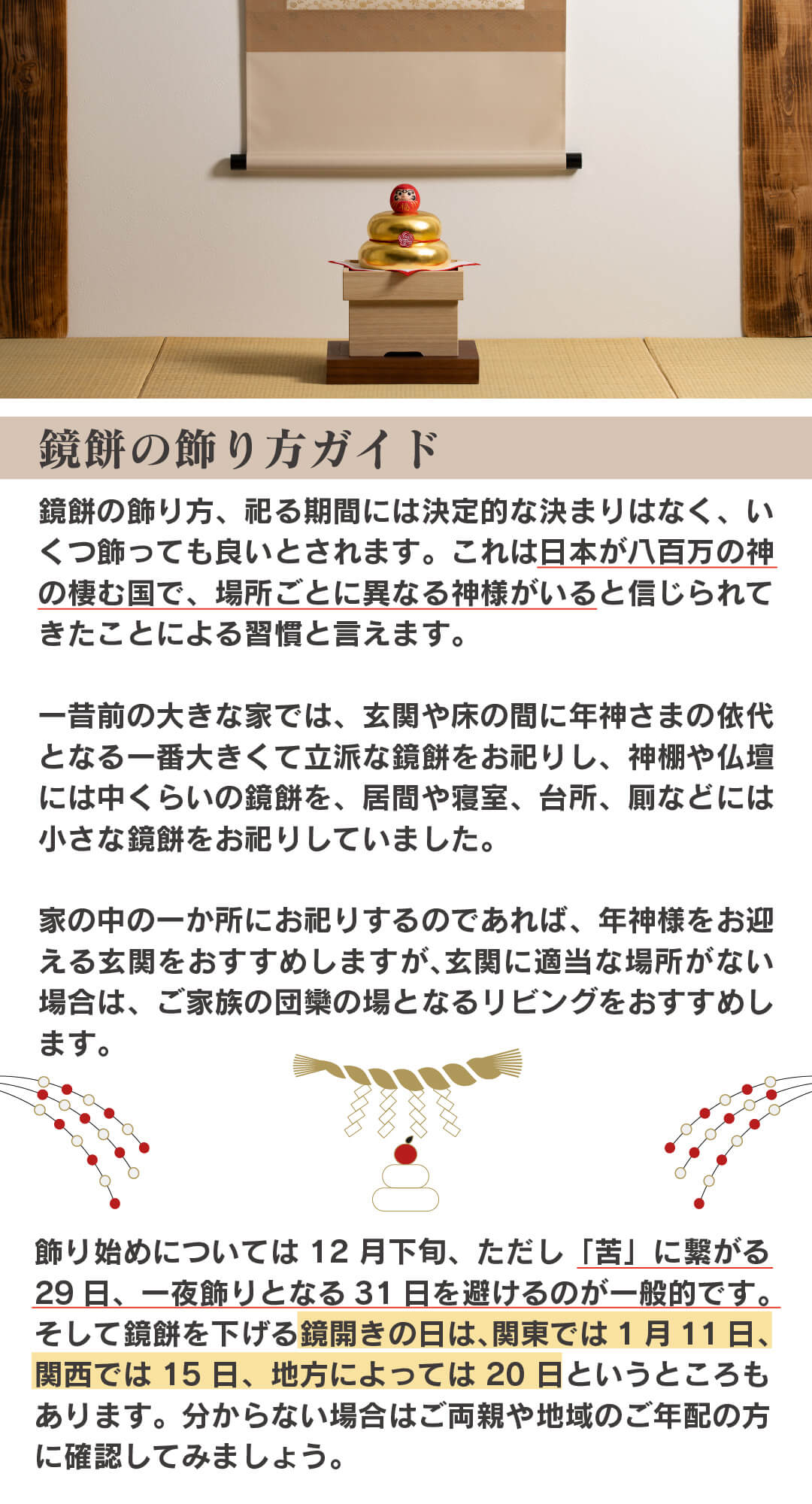 【回答4】 飾り始めについては12月下旬、ただし「苦」に繋がる29日、一夜飾りとなる31日を避けるのが一般的です。そして鏡餅を下げる鏡開きの日は、関東では1月11日、関西では15日、地方によっては20日というところもあります。分からない場合はご両親や地域のご年配の方に確認してみましょう。