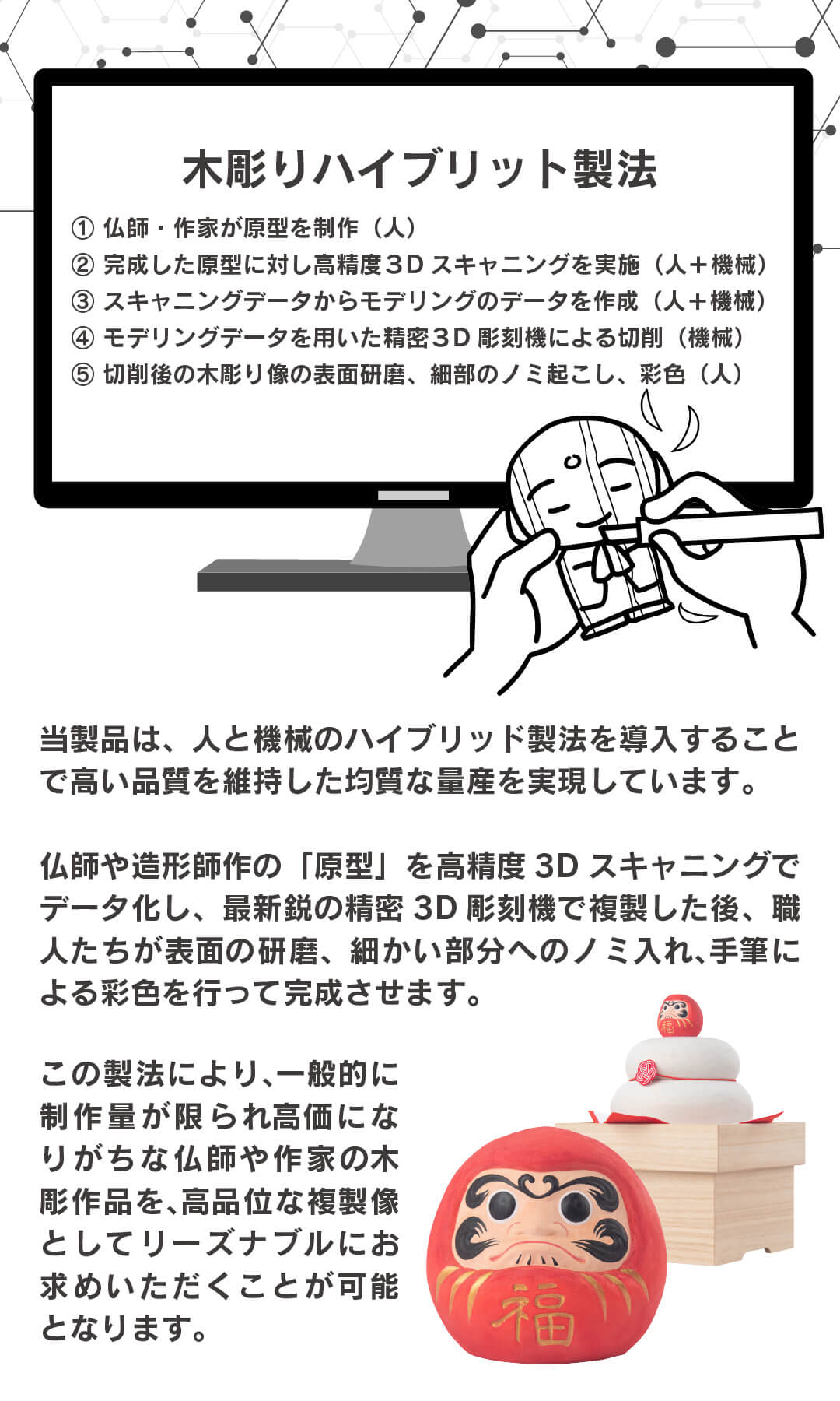■群馬選出の歴代総理や日本代表スポーツチームの必勝祈願で知られる少林山達磨寺の祈祷を受けた木彫りの達磨像! 『木彫りの縁起だるま』は、縁起だるまの聖地として親しまれる少林山達磨寺にて開眼供養(心眼を開く法要)と所願成就の御祈祷を賜ってお届けする、まさに至高の縁起だるまです。