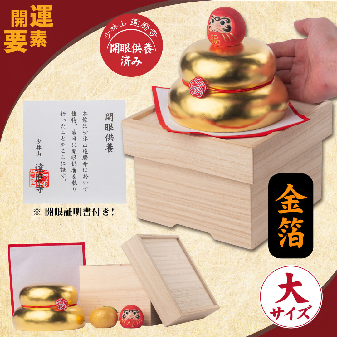 開運アイテム | 【木製鏡餅&達磨で新年をより良い年に!】 達磨 金箔鏡餅(福々しい大サイズ)張り子達磨発祥「達磨寺」で祈祷済み! ≫少林山達磨寺祈祷開眼の達磨が付属!オブジェ 新年 インテリア 置物 お飾り かがみもち お正月のご紹介